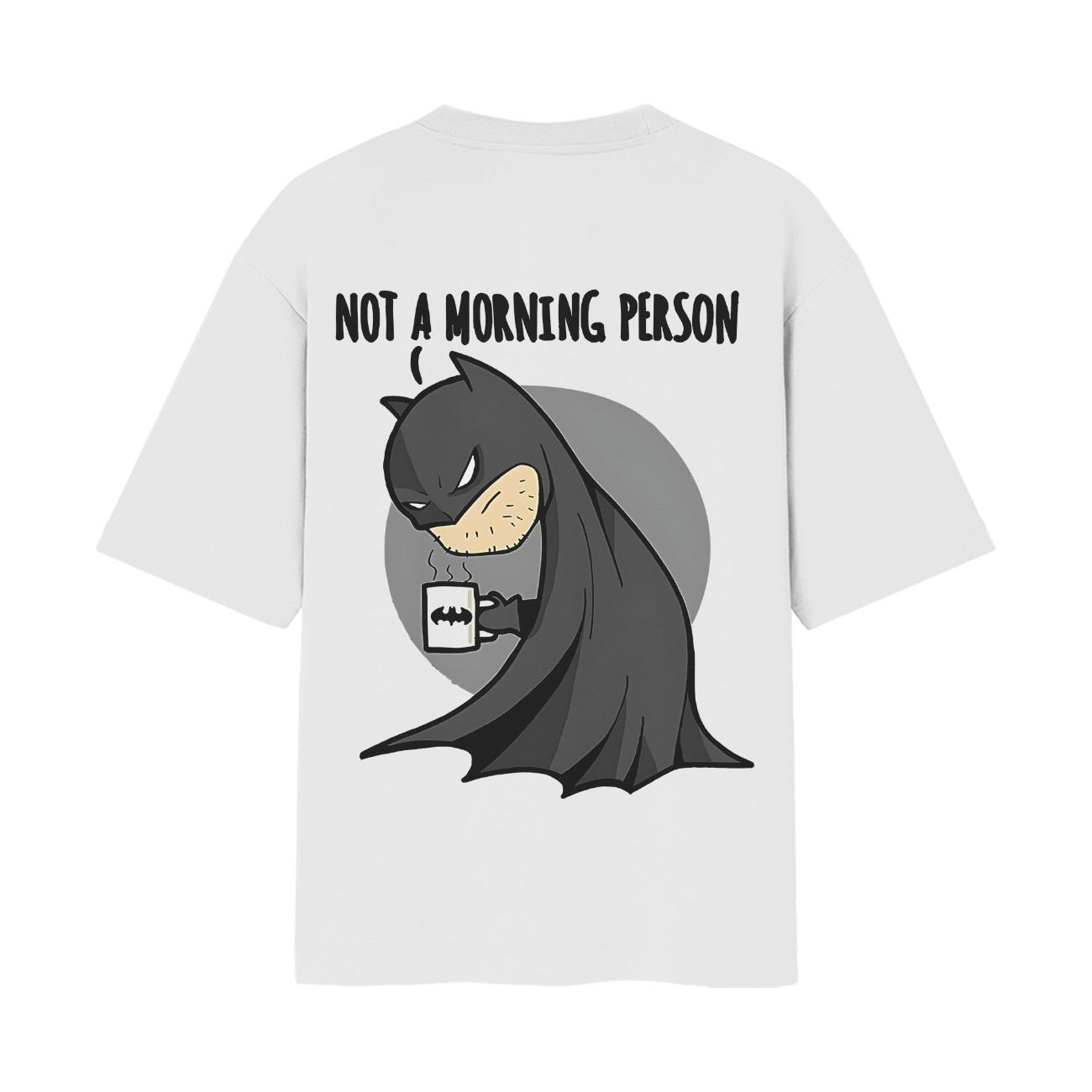 Even superheroes need caffeine, and this tee proves it. Featuring a grumpy, unshaven Batman clutching his bat-logo mug with the brutally honest line “Not A Morning Person,” this oversized white tee captures peak anti-a.m. energy. It’s the perfect fusion of cartoon sarcasm and streetwear simplicity.