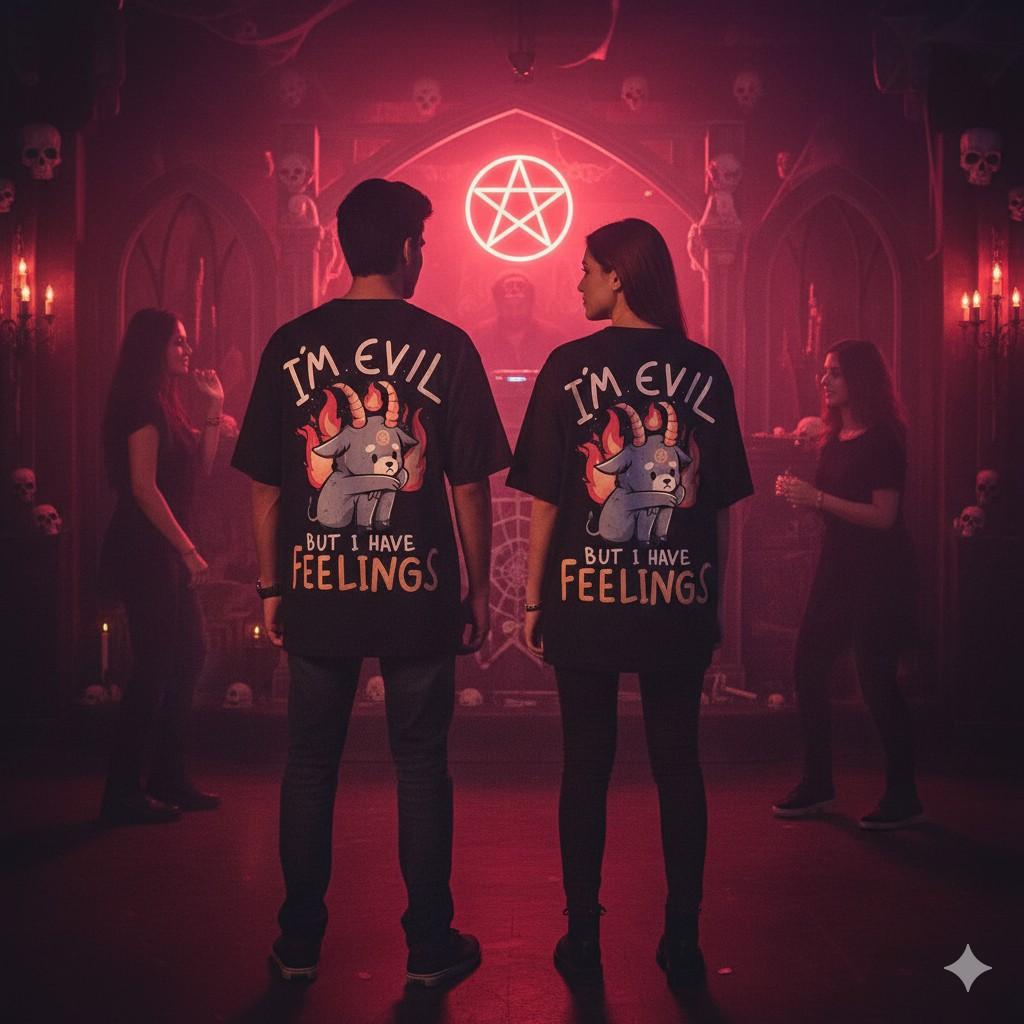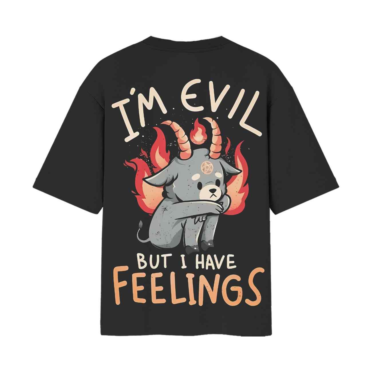 Meet the misunderstood icon of our “I’m Evil But I Have Feelings” tee. Printed on premium black oversized fabric, this tee features a sad little goat demon — horns blazing, eyes teary — trying to tell the world that even villains have emotions.