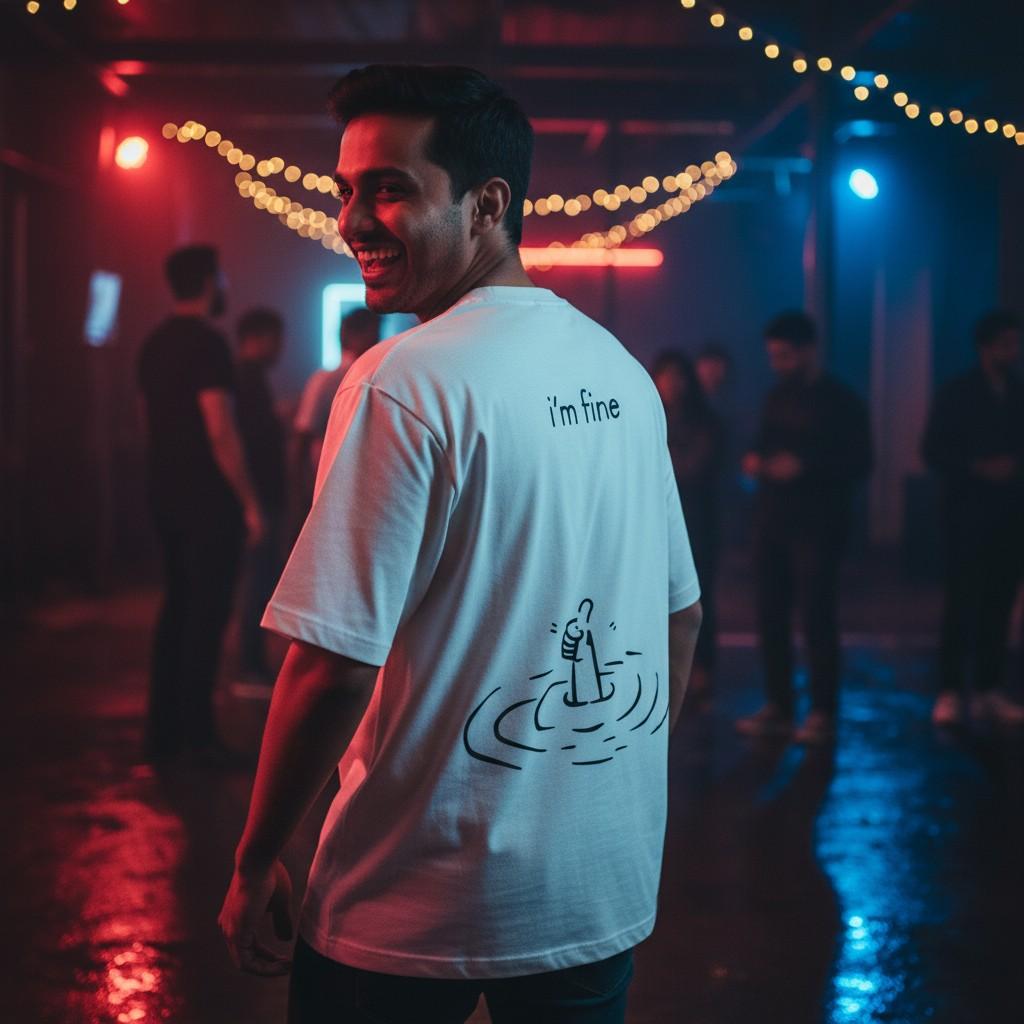 Introducing the ultimate emotional support T-shirt for the mentally overworked and emotionally under-rested. Featuring a minimal yet powerful graphic of a lone hand giving a thumbs-up as it sinks beneath rippling water — with the ironically cheerful caption “i’m fine” — this oversized streetwear piece gets you better than your therapist.
