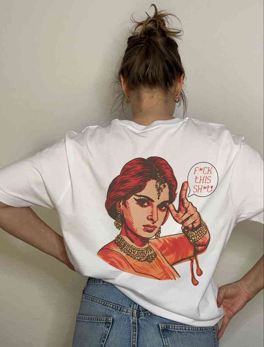 This oversized white tee from OoltaSeedha features a bold and unapologetic Indian queen striking a classic Bollywood dance pose — but with a twist. She isn’t just dancing… she’s done with everyone’s drama. With her hand raised and her expression fierce, she’s captured mid-moment saying, “FCK THIS SHT” — a mic-drop in cotton form.