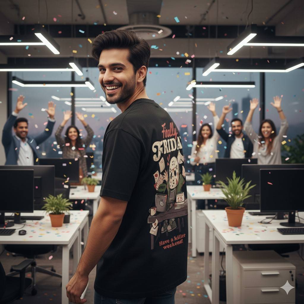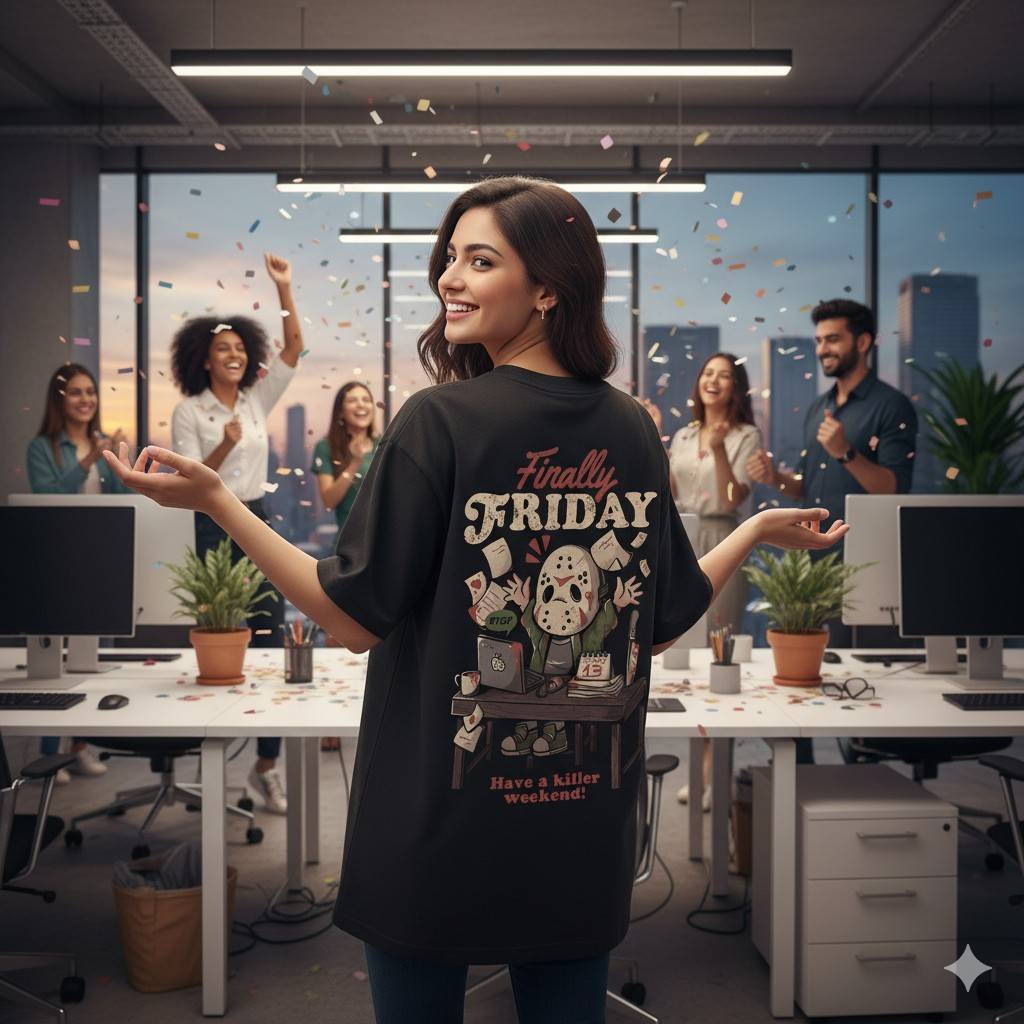 Say hello to the “Finally Friday” oversized tee by OoltaSeedha — where horror meets humor! Featuring the iconic masked villain from Friday the 13th, reimagined in a cute chibi avatar, throwing papers in the air after a hectic workweek. He’s done, he’s free, and he’s ready to make the weekend a “killer” one — just like you!