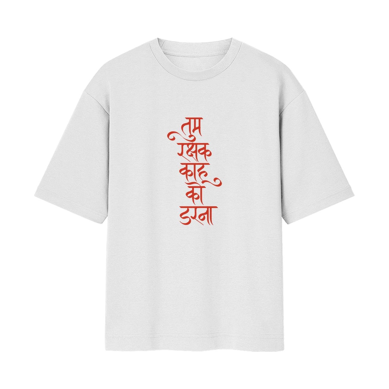 Invoke divine strength and desi street swag with the Hanuman Strength oversized t-shirt from OoltaSeedha. The front features the powerful quote from the Hanuman Chalisa — “तुम रक्षक काहू को डरना” — written vertically in a bold red Devanagari script, radiating spiritual intensity. Flip it around, and Hanuman Ji stands tall and muscular, mace on shoulder, showcasing his godlike physique — the ultimate symbol of strength, protection, and raw devotion.