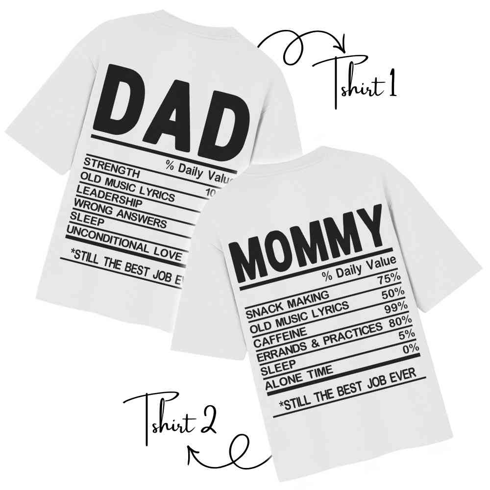 Forget the generic “Best Dad/Mom” mugs; it’s time to wear your daily hustle on your back. Our Ingredients of Mom & Dad Oversized Set is a sartorial breakdown of what actually goes into the chaotic, beautiful masterpiece of parenting. From a staggering 99% caffeine dependency to the inevitable 110% leadership (and the tragic 0% alone time), these tees serve as the ultimate wearable infographic for the CEOs of the household.