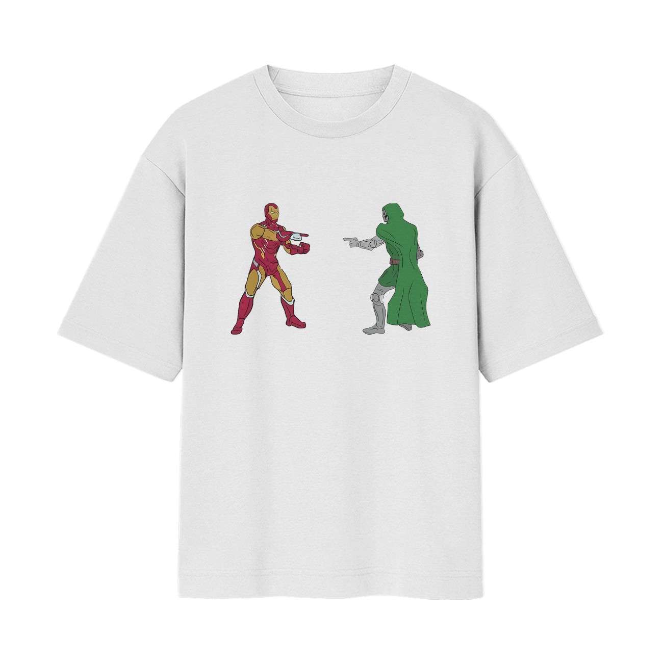 Brace yourself for the ultimate multiverse slap! This t-shirt isn’t just cotton—it’s a crossover moment. Featuring Ironman and Doctor Doom in a hilarious parody of pop culture’s biggest plot twist, the front design shows them in a classic Mexican standoff, while the back steals the show with Doom silencing Ironman mid-dialogue with a comic-style smackdown—because guess who’s donning the Doom armor now? (Hint: RDJ).