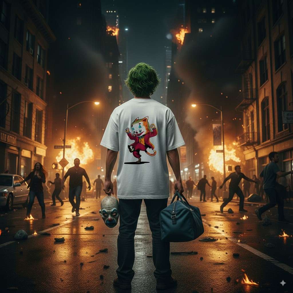 Meet the wildest crossover your wardrobe didn’t know it needed — the Joker Cat tee from OoltaSeedha. A bold mashup of the iconic Joker dance move from the cult-favorite film, reimagined with a quirky feline twist. Dressed in full Joker attire, this cartoon cat is caught mid-groove, giving chaotic-meets-cute energy in one slick move.
