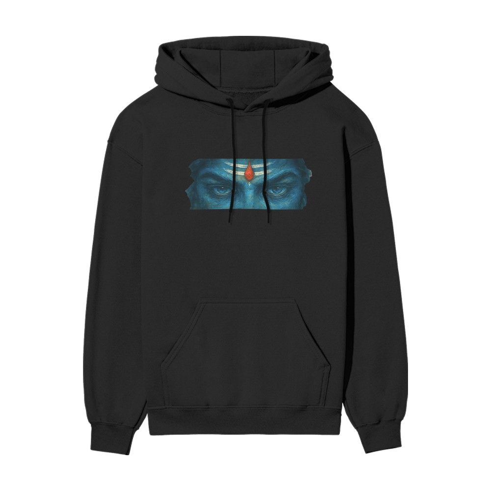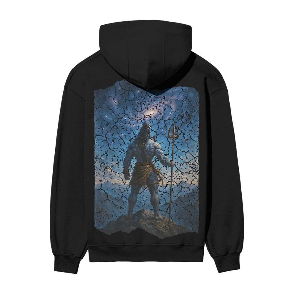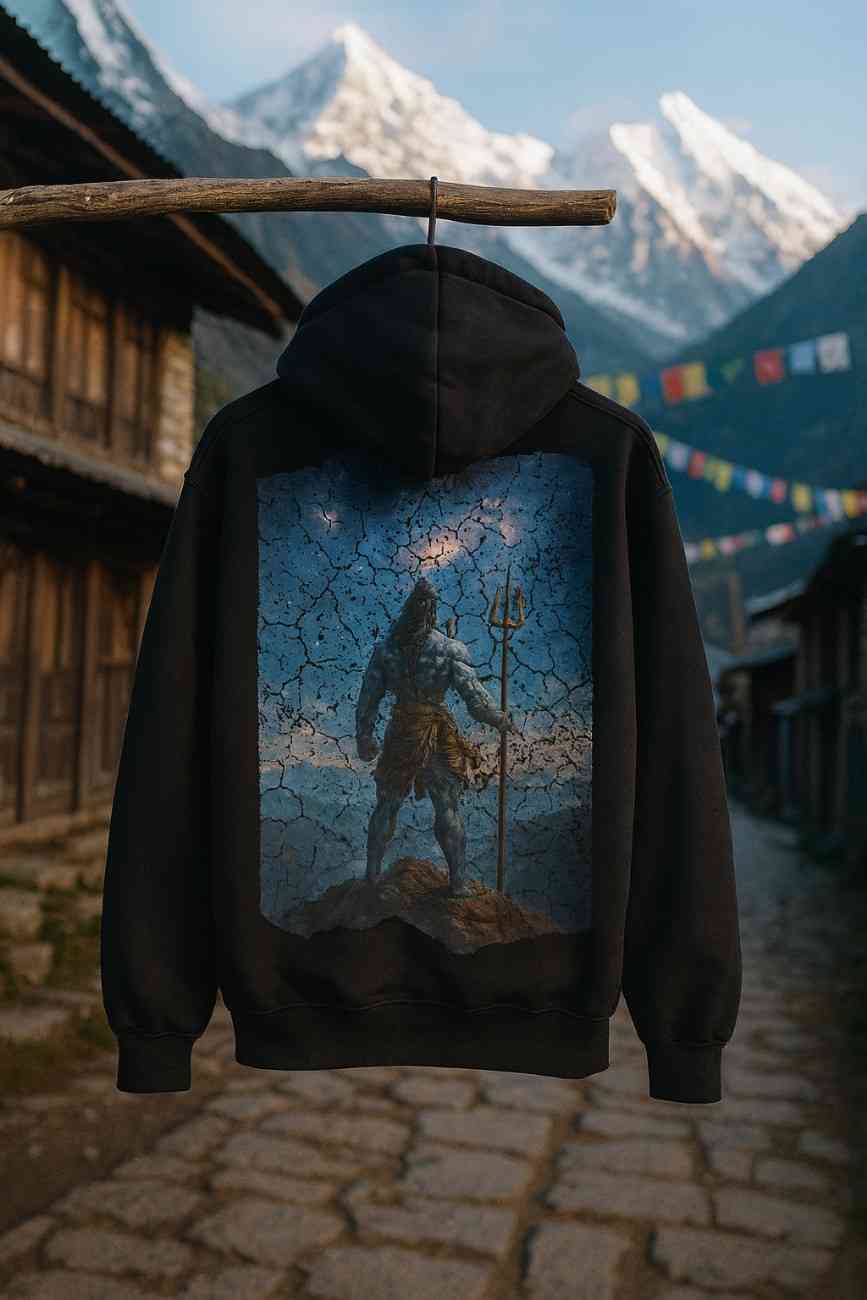 Feel the cosmic energy of Mahadev. The front of this black oversized tee showcases intense Shiva eyes that pierce the soul, while the back reveals an epic artwork of Lord Shiva gazing over the universe from a mountain peak.