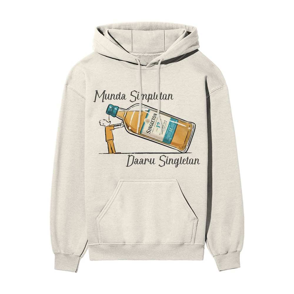 Simple boys. Complex choices. This hoodie is for the ones who keep their hearts clean and their glasses neat. With the quirky line “Munda Simpleton, Daaru Singleton” splashed across the front and an eye-catching print of a whiskey pour, this piece perfectly captures the essence of a chill soul with elite taste.
