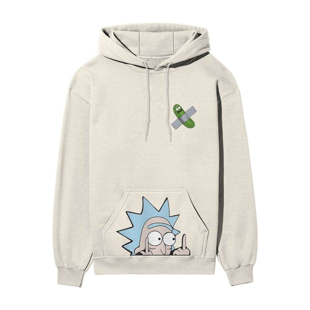 Channel chaos, sarcasm, and sci-fi rebellion in one iconic drop. This oversized off-white hoodie features Rick & Morty giving the universal salute (yes, that middle finger), paired with a taped-up Pickle Rick right above — as if slapped on by a deranged scientist mid-meltdown.