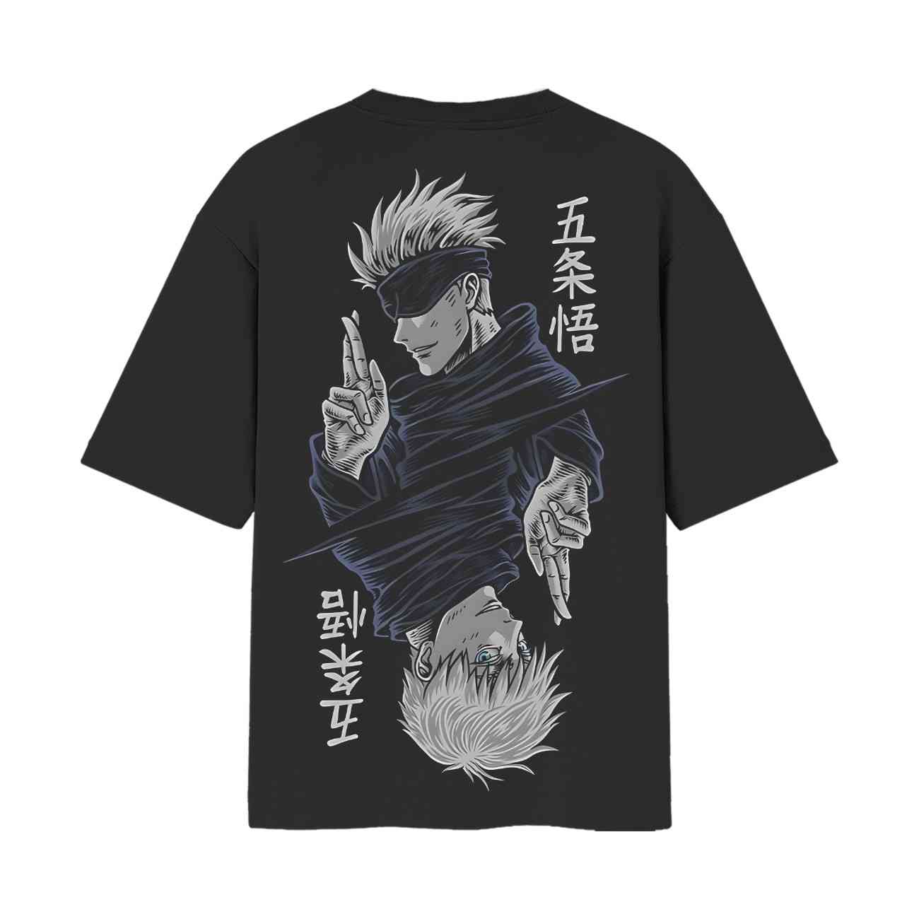 Some power doesn’t need to be seen to be felt. This design channels the aura of an untouchable sorcerer — blindfolded, composed, fingers poised in quiet dominance. The mirrored artwork plays with the Oolta Seedha philosophy itself — chaos and control, calm and carnage, light and shadow. It’s not just anime art. It’s attitude wrapped in silence.