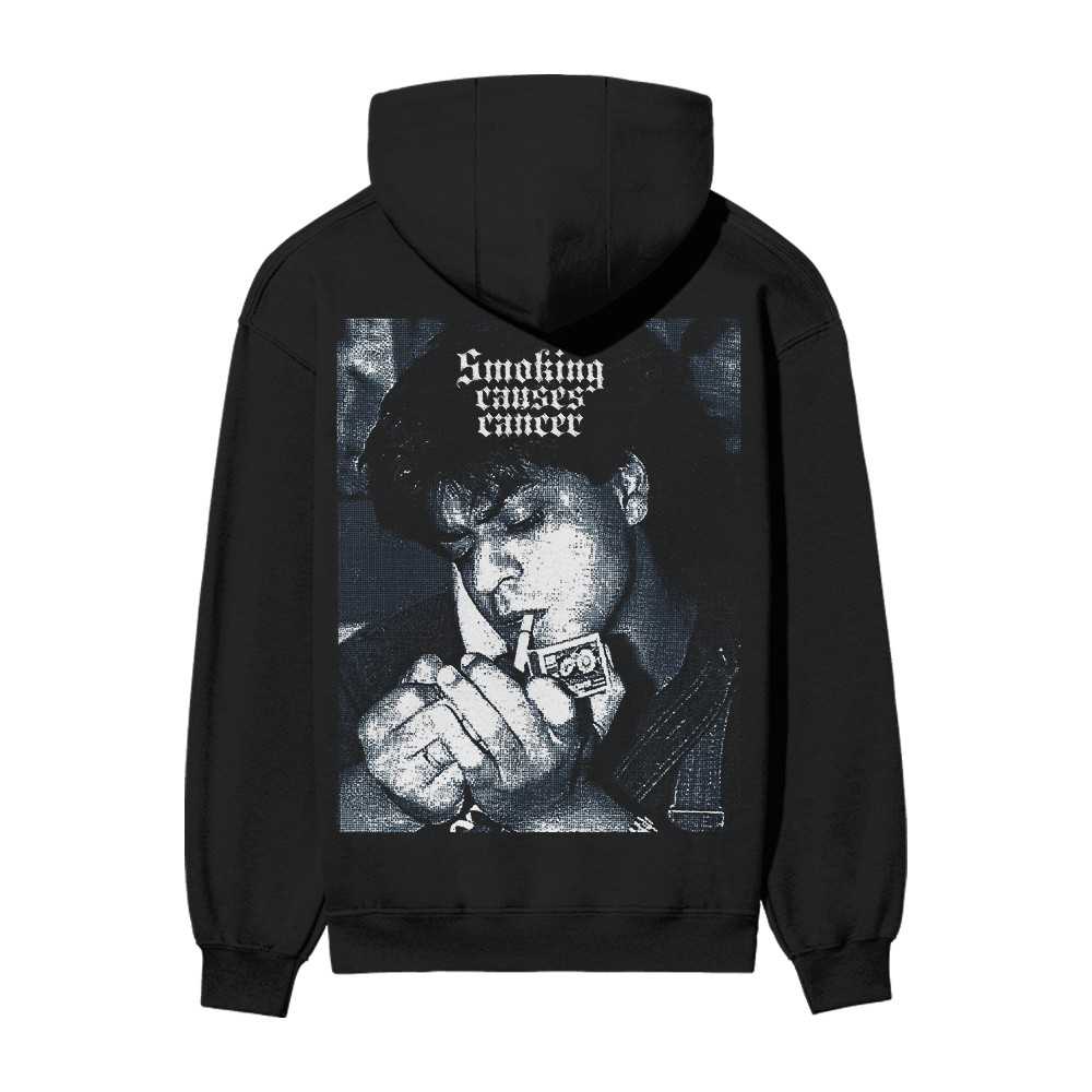 This hoodie blends cult nostalgia with street ethics—featuring a rare grayscale graphic of Shah Rukh Khan mid-smoke and the bold, gothic-text reminder: “Smoking Causes Cancer.” It’s raw, it’s real, it’s rebellious. A wearable paradox that both idolizes and cautions, celebrating the era when Bollywood bad boys ruled hearts (and headlines).