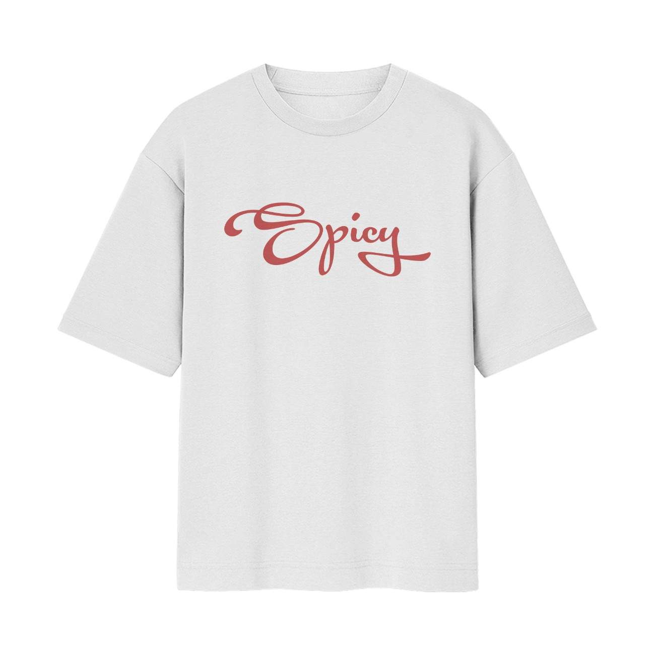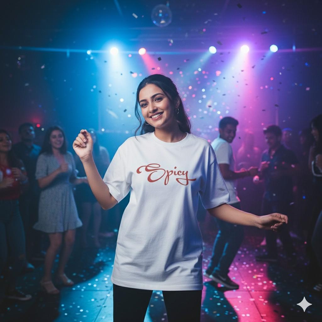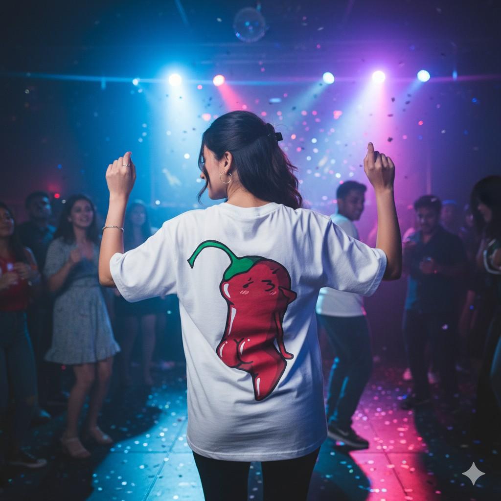 This oversized white t-shirt from OoltaSeedha features the playful hand-lettered word “Spicy” on the front, but the real showstopper is on the back — a quirky cartoon chilli pepper flaunting its sass with confidence and curves! 🍑🌶️