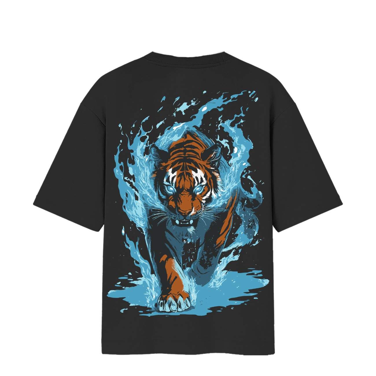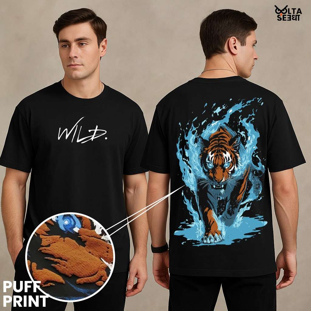 Unleash your wild side with the bold and unapologetic “Wild Tiger Flame” Oversized T-shirt from OoltaSeedha. The front features a minimalist handwritten “WILD.” text in white, while the back steals the show with a high-definition puff print of a tiger striding through blue flames – radiating raw power and primal energy.